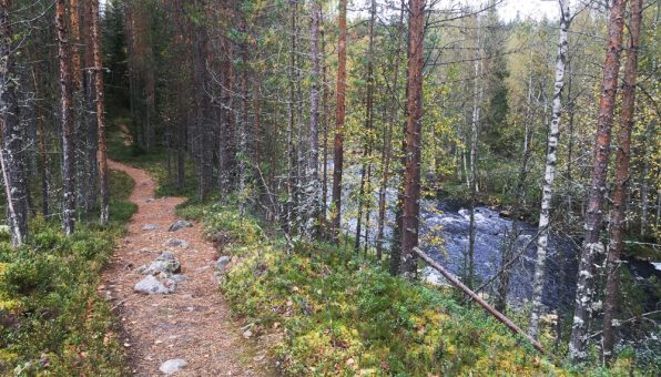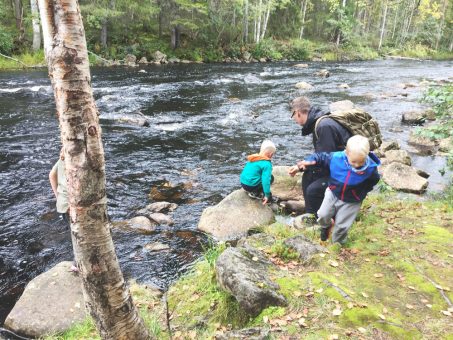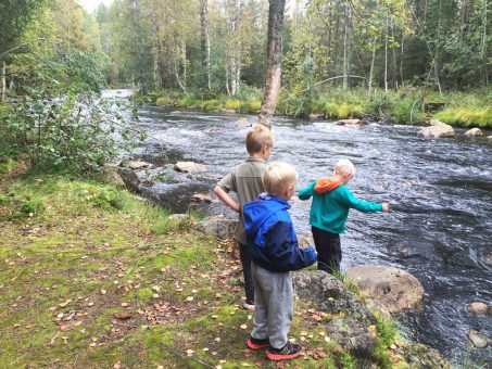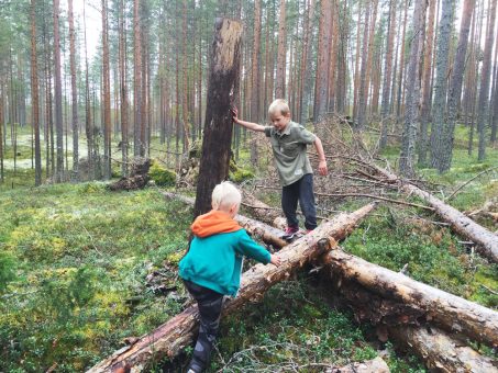 The terrain continued as a nicely varied, similar type of pine forest until the middle of the route, when we were greeted by a long-awaited lunch break and a shed where the fires were ready for us from the footsteps of previous hikers. The sloping roof shed was like designed for children to climb, and the sausages were eaten naturally, waving their legs over the edge of the roof. At the shed, you should take a peek at the bend made by the Tiilikkajoki River, which flows a little lower. After the shed, the terrain of the route became slightly different. We soon got to see what a trace the storm that had raged a couple of years ago had produced; trees were still fallen everywhere. In nature parks, they are allowed to remain in their natural state to moss and land, only along the path the route had been opened. When in traffic with over-energetic boys aged 3-6, the most attractive route really doesn’t go along the trails but over the fallen tree trunks, parkouring. At the end of the route, the scenery was particularly picturesque, with the trail progressing over a high ridge and the noisy Tiilikkajoki River, which is also part of the Älänne canoe route, progressing considerably lower next to it. Be careful with toddlers and older children at this point, as the drop-off down to the waterfall is quite steep.